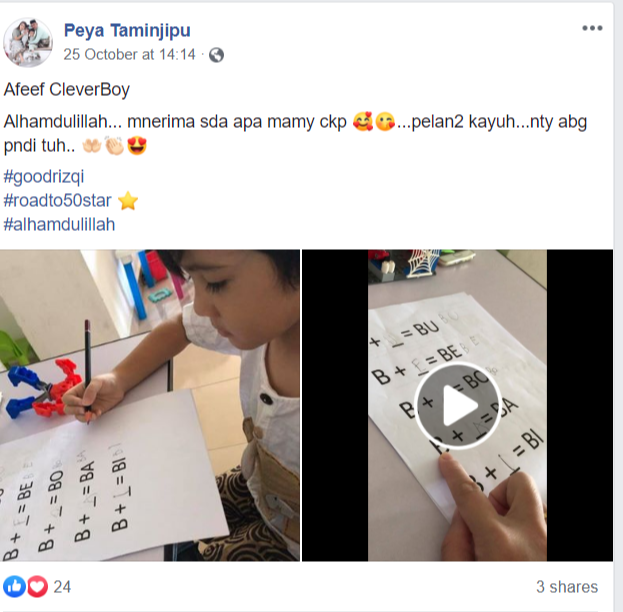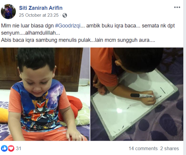Bermula dari hari tu, kami terus perbaiki kaedah ni sehingga lah ke hari ni. Perubahan Rizqi sangat luar biasa buat kami.